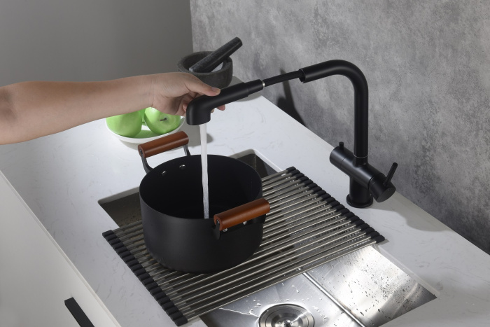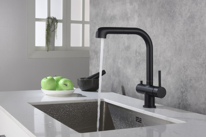 Смеситель Timo Saona 2346 с выдвижной лейкой и системой подключения фильтрованной воды относится к премиальному сегменту, предназначен для монтажа на кухонную мойку или столешницу. Высокий излив подходит для моек с двумя чашами, а также позволяет справляться с мытьем габаритной посуды. Удобное (вертикальное) расположение рычага смесителя в крайнем положении "холодный старт", позволяет не задевать ручкой за стеновые панели, фартук, предметы, которые находятся за смесителем. Картридж с функцией "холодный старт" работает в диапозоне 90 градусов, рычаг установленный в исходное положение (вертикально) при открытии подает только холодную воду, а не 50% холодной воды плюс 50% горячей, позволяя экономить до 30% расход горячей воды. Для подачи горячей воды необходимо повернуть рычаг на себя. Выдвижная лейка с прочным шлангом длинной 400мм облегчает мытье раковины, крупной посуды, позволяет набрать воду в емкость, стоящую рядом с