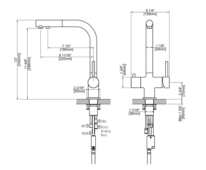 Смеситель Timo Saona 2356 с выдвижной лейкой и системой подключения фильтрованной воды относится к премиальному сегменту, предназначен для монтажа на кухонную мойку или столешницу. Высокий излив подходит для моек с двумя чашами, а также позволяет справляться с мытьем габаритной посуды. Удобное (вертикальное) расположение рычага смесителя в крайнем положении "холодный старт", позволяет не задевать ручкой за стеновые панели, фартук, предметы, которые находятся за смесителем. Картридж с функцией "холодный старт" работает в диапозоне 90 градусов, рычаг установленный в исходное положение (вертикально) при открытии подает только холодную воду, а не 50% холодной воды плюс 50% горячей, позволяя экономить до 30% расход горячей воды. Для подачи горячей воды необходимо повернуть рычаг на себя. Выдвижная лейка с прочным шлангом длинной 400мм облегчает мытье раковины, крупной посуды, позволяет набрать воду в емкост