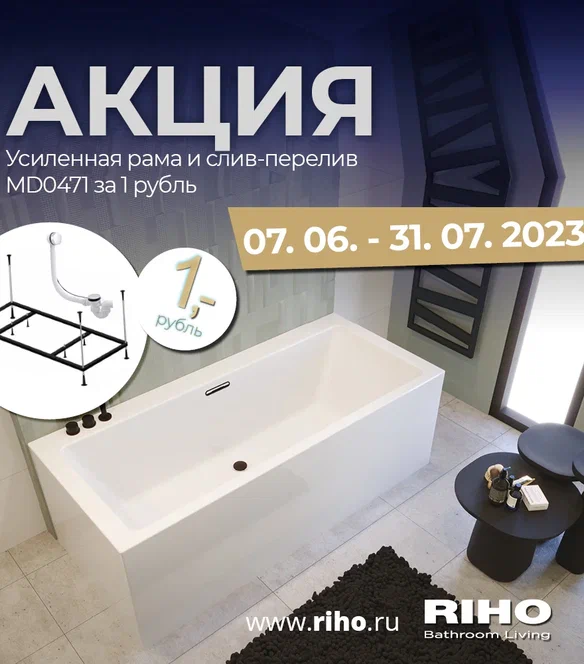 При покупке ванны бренда Riho в магазине АртСантехника с 07 июня 2023 г. по 31 августа 2023 года - усиленная рама и слив перелив MD0471 за 1 рубль.