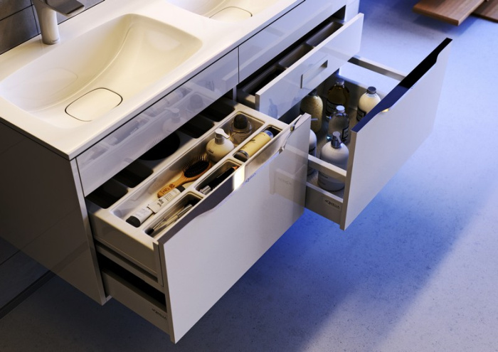 - В соответствии с зонами умывальников тумба оборудована 2 ящиками полного выдвижения и системой закрывания