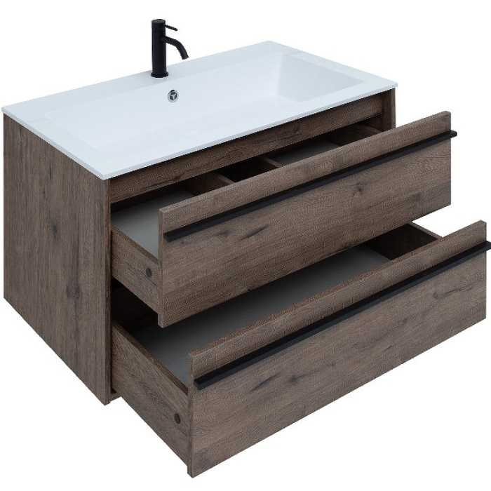 У нее удобная зона хранения: два выдвижных ящика, оборудованных доводчиками, словно утоплены внутрь корпуса. Тонкие изящные ручки во всю ширину ящиков. Именно они находятся в одной плоскости с боковыми стенками. Выглядит стильно. К тому же, безопасно, так как нет выступающих деталей. Кстати, ручки отечественного производства. Сделаны из алюминия, чтобы исключить возможность коррозии, по заказу Aquanet специально для этой коллекции. Сверху на них нанесено эмалевое покрытие. Корпус и фасады тумбы шириной 90 см – из влагостойкого ЛДСП.