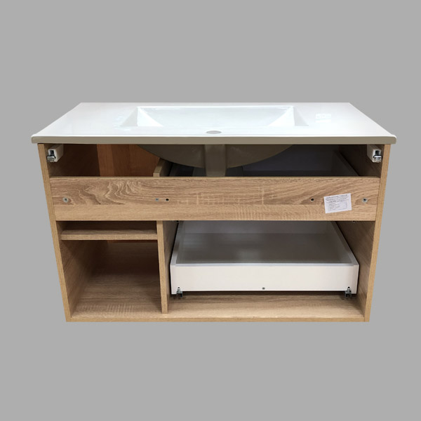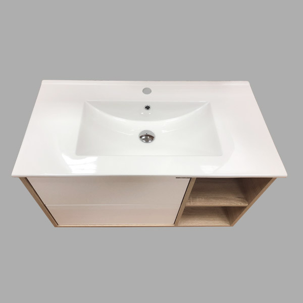 Подвесная тумба с двумя ящиками оборудованными системой открытия при нажатии Push-to-Open и пространством для открытого хранения. Фасады ящиков выкрашены белой глянцевой эмалью