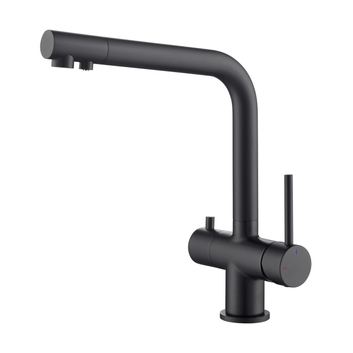 Смеситель Timo Saona 2396 с системой подключения фильтрованной воды относится к премиальному сегменту, предназначен для монтажа на кухонную мойку или столешницу. Высокий излив подходит для моек с двумя чашами, а также позволяет справляться с мытьем габаритной посуды. Удобное (вертикальное) расположение рычага смесителя в крайнем положении "холодный старт", позволяет не задевать ручкой за стеновые панели, фартук, предметы, которые находятся за смесителем. Картридж с функцией "холодный старт" работает в диапозоне 90 градусов, рычаг установленный в исходное положение (вертикально) при открытии подает только холодную воду, а не 50% холодной воды плюс 50% горячей, позволяя экономить до 30% расход горячей воды. В нижней части смесителя установлены 2 трубки с адаптером (можно подключиться к любой из них) для соединения с трубкой фильтра. Подача фильтрованной воды осуществляется поворотом ручки дивертора, расположенной слева на