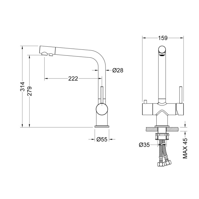 Смеситель Timo Saona 2396 с системой подключения фильтрованной воды относится к премиальному сегменту, предназначен для монтажа на кухонную мойку или столешницу. Высокий излив подходит для моек с двумя чашами, а также позволяет справляться с мытьем габаритной посуды. Удобное (вертикальное) расположение рычага смесителя в крайнем положении "холодный старт", позволяет не задевать ручкой за стеновые панели, фартук, предметы, которые находятся за смесителем. Картридж с функцией "холодный старт" работает в диапозоне 90 градусов, рычаг установленный в исходное положение (вертикально) при открытии подает только холодную воду, а не 50% холодной воды плюс 50% горячей, позволяя экономить до 30% расход горячей воды. В нижней части смесителя установлены 2 трубки с адаптером (можно подключиться к любой из них) для соединения с трубкой фильтра. Подача фильтрованной воды осуществляется поворотом ручки дивертора, расп