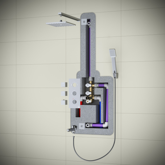 Душевая система с термостатом Tetra-thermo 0199, относится к премиальному сегменту, предназначена для монтажа в полой или твердой стене. Термостатический картридж поддерживает стабильную температуру воды, обеспечивая максимально комфортные условия для принятия водных процедур. Регулируя напор воды в режиме "тропический душ" можно получить массажное воздействие различной интенсивности. В комплектацию душевой системы входит излив, с его помощью можно наполнить ванну, ведро воды и т.д. Основные преимущества встроенной системы: элегантный внешний вид, все коммуникации и крепления спрятаны в стену снаружи видны только декоративные элементы. Установить встроенную систему можно в любом месте. Использовать такой смеситель очень удобно, регулировка температуры воды осуществляется ручкой термостата (расположена снизу). Включение режима "тропический душ" осуществляется поворотом ручки дивертора (расположена сверх